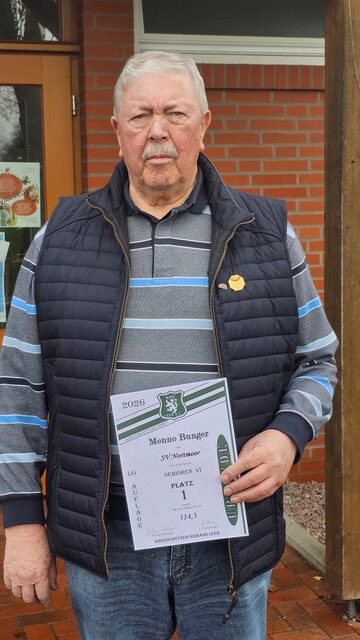 Ebenfalls mit zwei Titel dekoriert reihte sich Menno Bunger vom SV Nortmoor in die Riege der 300er Schützen ein. In der Klasse Senioren VI gewann er Gold mit 301,0 Ringen in der Disziplin 50m Auflage mit ZF und mit 300,9 Ringen Gold in der Disziplin 50m Auflage.